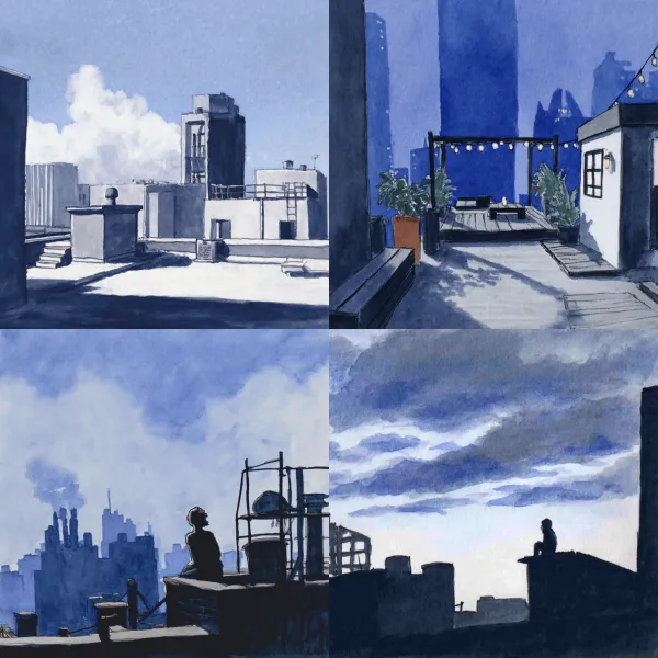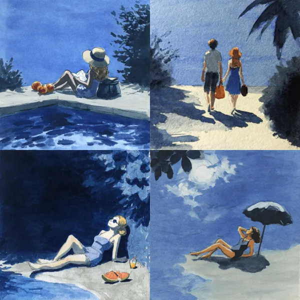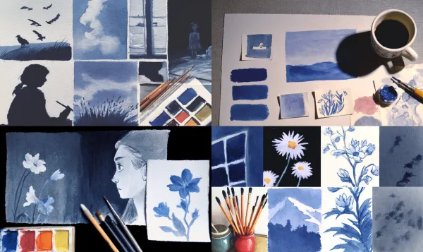 Aquamarine Gouache Unlock your potential with stilodex » Discipline:Plastic Arts. Visual style:artistic illustration. Application:book illustration. Stroke:variable, irregular, discontinuous. Palette:visible canvas, basic, cold, limited. Technique:gouache, watercolor. Complexity:low. Emotion:serenity, tranquillity, simplicity, simpleness. Theme:everyday life.