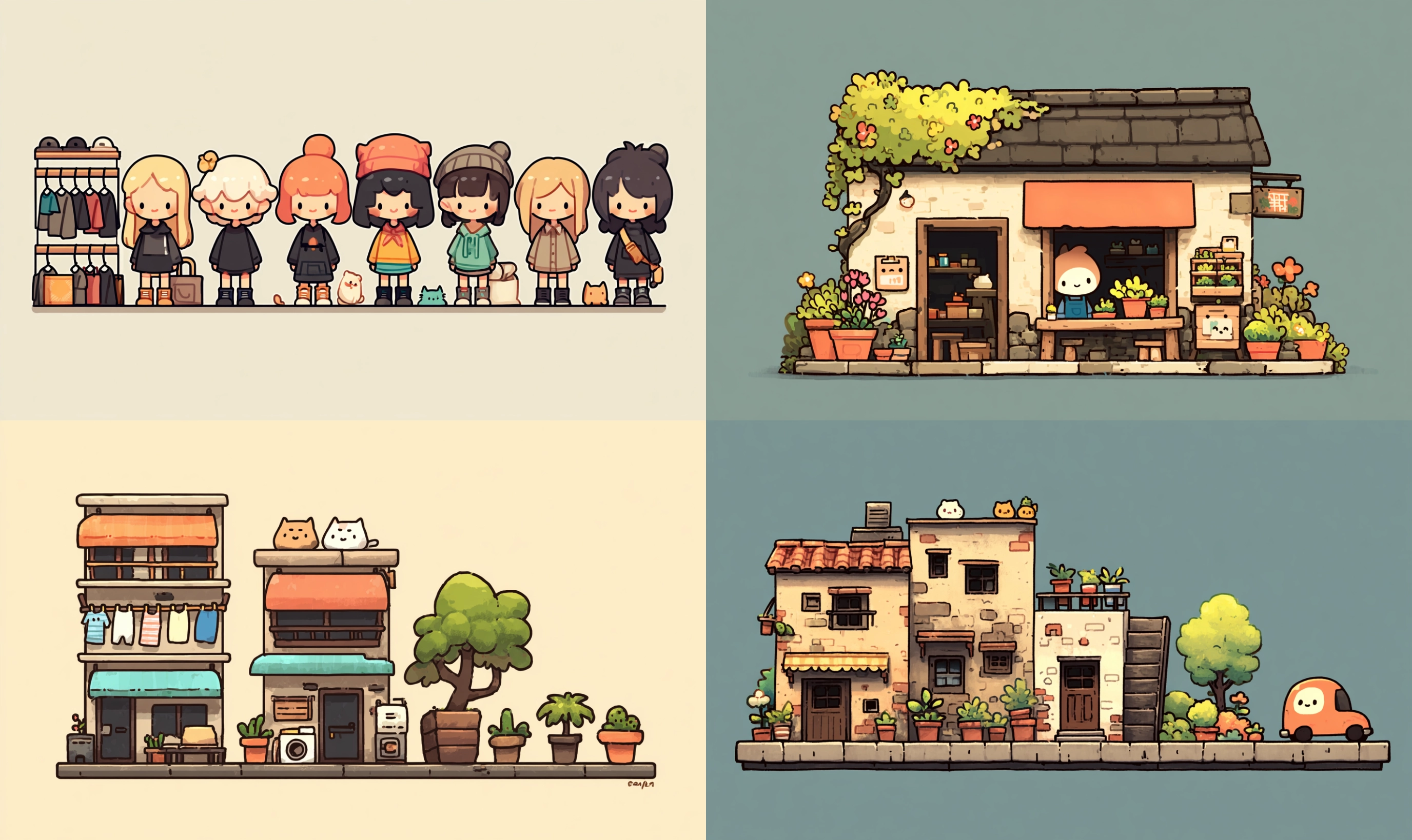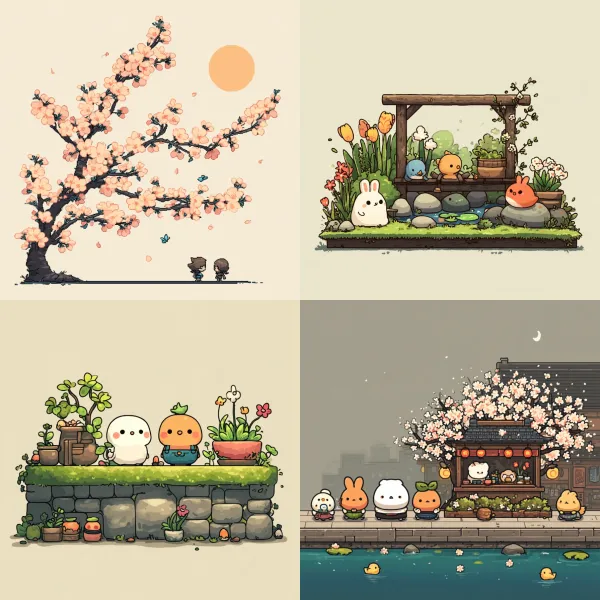 Chibi Acogedor Interactivo Desbloquea tu potencial con stilodex » Disciplina:Animación, Ilustración. Estilo visual:Wholesome Games. Aplicación:videojuegos. Trazo:irregular, constante, sencillo, perdido. Paleta:cálida, limitada, análoga. Técnica:digital, pixel art, vectores, sprites 2D, step shading, 32 bits. Complejidad:baja. Emoción:ternura, acogida, Ma (間), calma, tranquilidad, seguridad, inocencia, amistad, aventura, confianza. Influencia:sanrio, iyashikei, calm tech, stardew valley, pokémon esmeralda. Composición:aislada, diorama. Temática:simulación agrícola, ruralidad. Textura:pixelada.