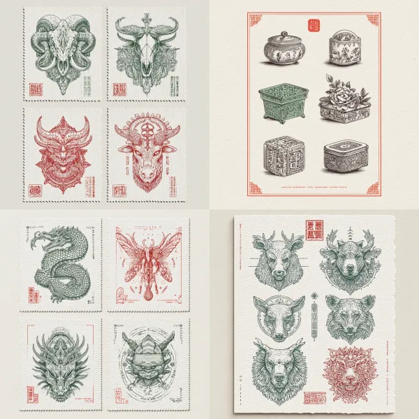Grabado Ornamental Chino Desbloquea tu potencial con stilodex » Disciplina:Ilustración. Estilo visual:Sello imperial. Aplicación:estampados, arte decorativo, artes gráficas. Trazo:ornamental, nítido, achurado, contorno medio. Paleta:duotono, canvas visible. Técnica:zhuanke, xilografía, yìnzhāng, hanko. Complejidad:alta. Emoción:maestría. Influencia:filatelia, grabado, intaglio, linograbado, calcografía, hedcut. Composición:centrada, geométrica, aislada.